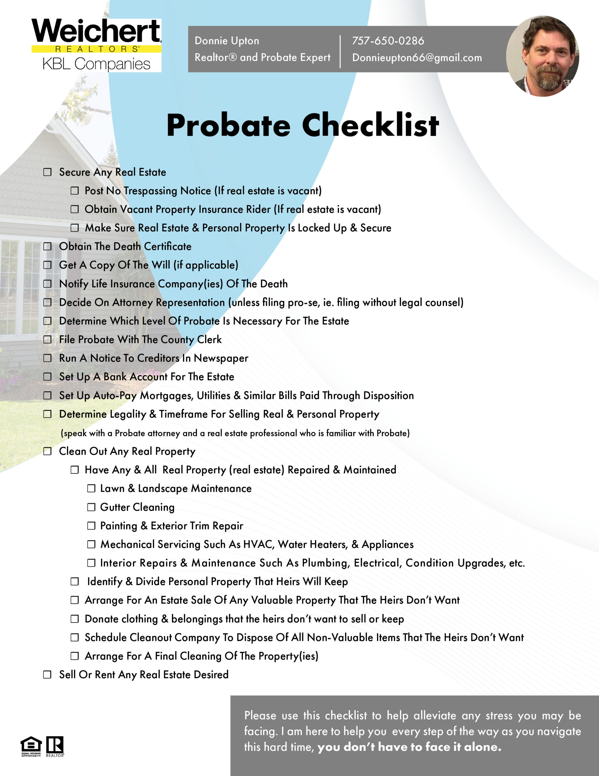 This is a checklist of some of the most common steps required when working though a probate case. While you should always consult an attorney to verify local and state laws and proceedings, this guide is an incredible resource to keep on hand.